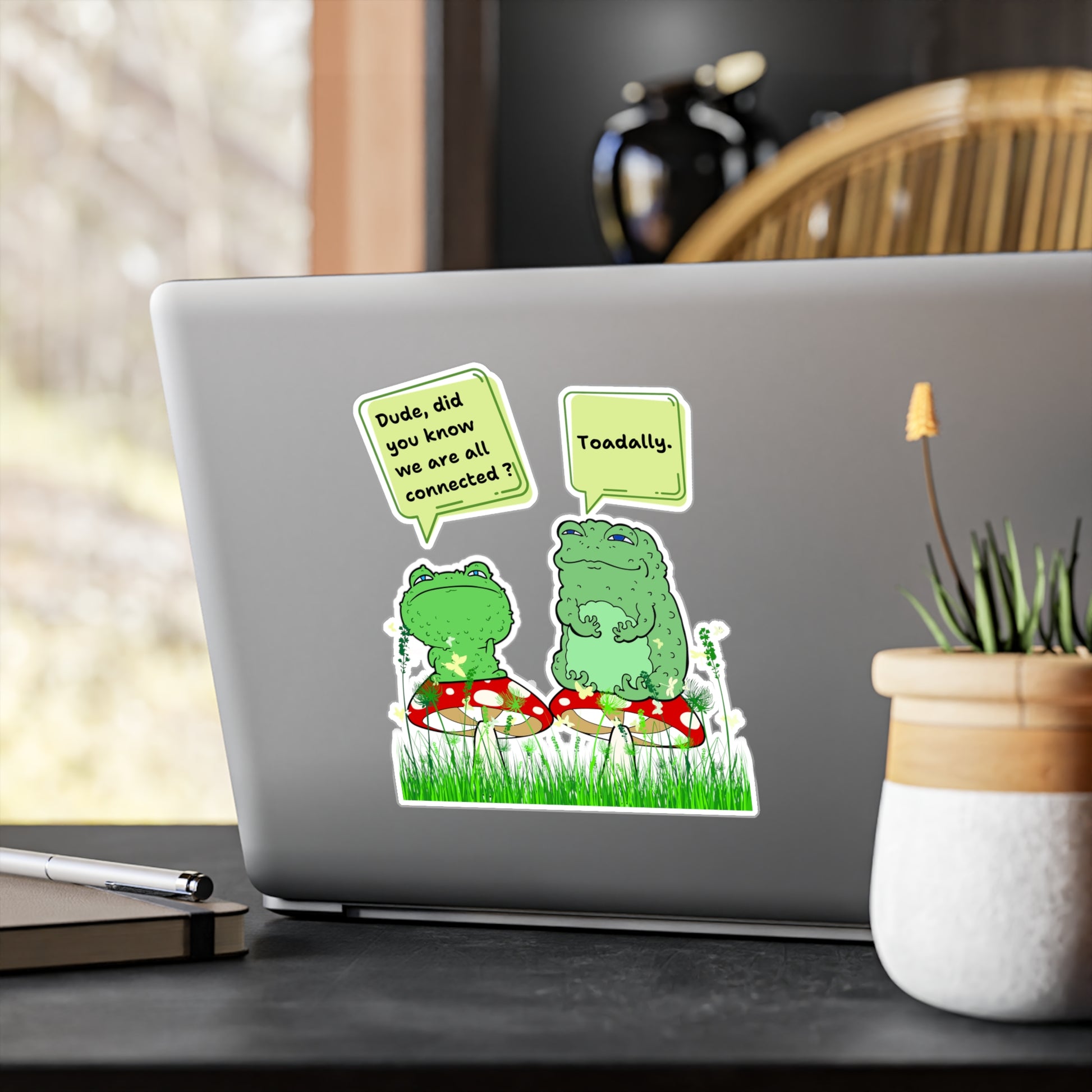 The whimsical design of two cartoon toads chatting on toadstools says it all: “Dude, did you know we are all connected? Toadally.”