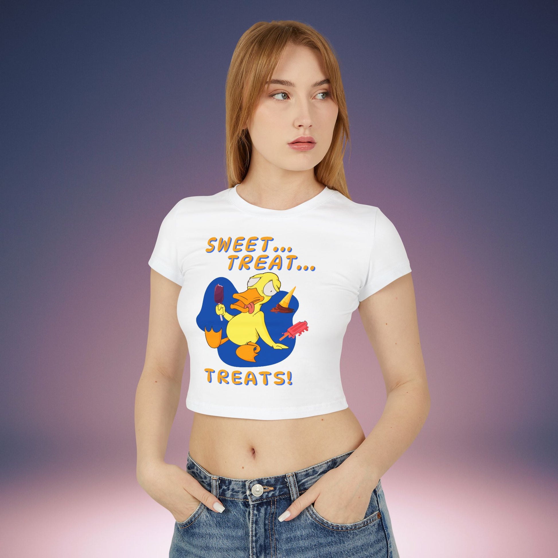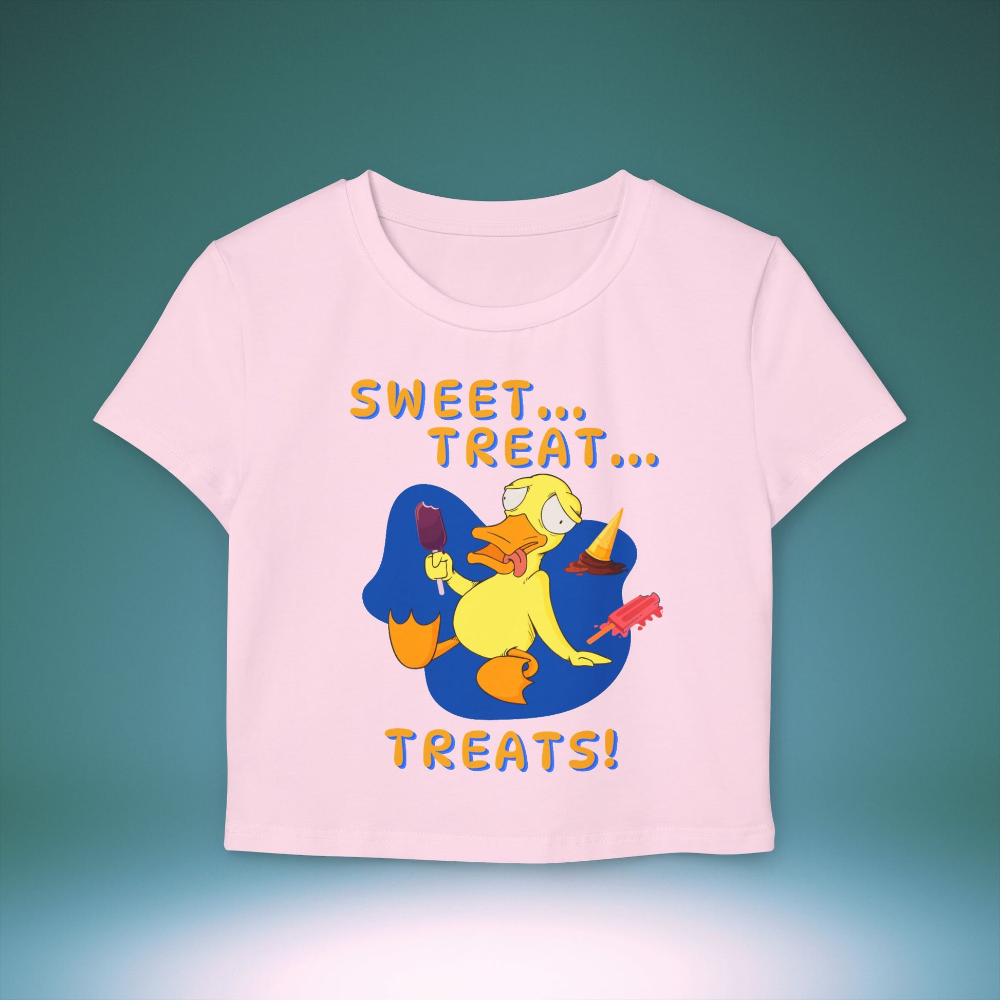 This sassy Tee features a gluttonous duck stuffed full of sweet treats while gurgling out the phrase: “Sweet...Treat...TREATS!”